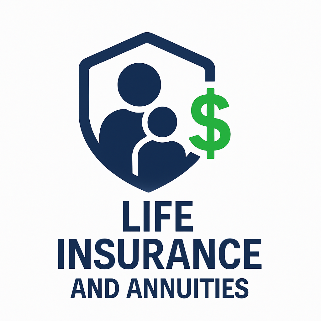 Illustration of a family inside a shield with a green dollar sign, and the text "Life Insurance and Annuities" below.